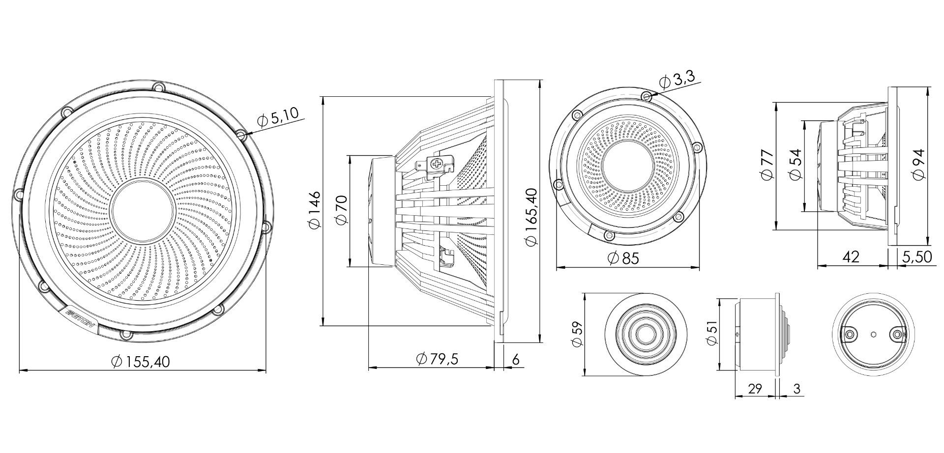 LOW/MID-RANGE DRIVER - 165 mm outer diameter, 8 screw points, arranged in a circle. Recommended frequency range: 50 Hz - 3000 Hz.