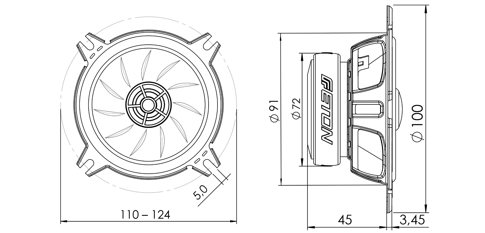 100 mm (4") Koaxial-Lautsprechersystem mit integriertem 19 mm (3/4") Gewebedom-Hochtöner mit durchlässigem Kunststoff-Berührschutz für maximalen Durchlass. Rippenversteifte Glasfaser-Papiermembran Technologie für besonders druckvolle und konturierte MidBass-Wiedergabe, dynamisch und auf den Punkt. Pulverbeschichteter Metallkorb im ETON-typischen Doppelstrebendesign mit zusätzlichen Belüftungsöffnungen und Versteifungen sowie ablengbare 4-Punkt Langlochaufnahme. Kräftiger Ferrit-Magnet mit 3 Ohm Impedanz Schwingspule – für maximalen Wirkungsgrad auch ohne zusätzlichen Verstärker. Nennbelastbarkeit: 50 W RMS, Musikbelastbarkeit 80 W, Impedanz 3 Ohm, Kennschalldruck 87 dB, Außendurchmesser 100–124 mm, Einbaudurchmesser 113 mm, Einbautiefe 45 mm. Mit intergriertem hochwertigem Hochton-Kondensator. Engineered in Germany.