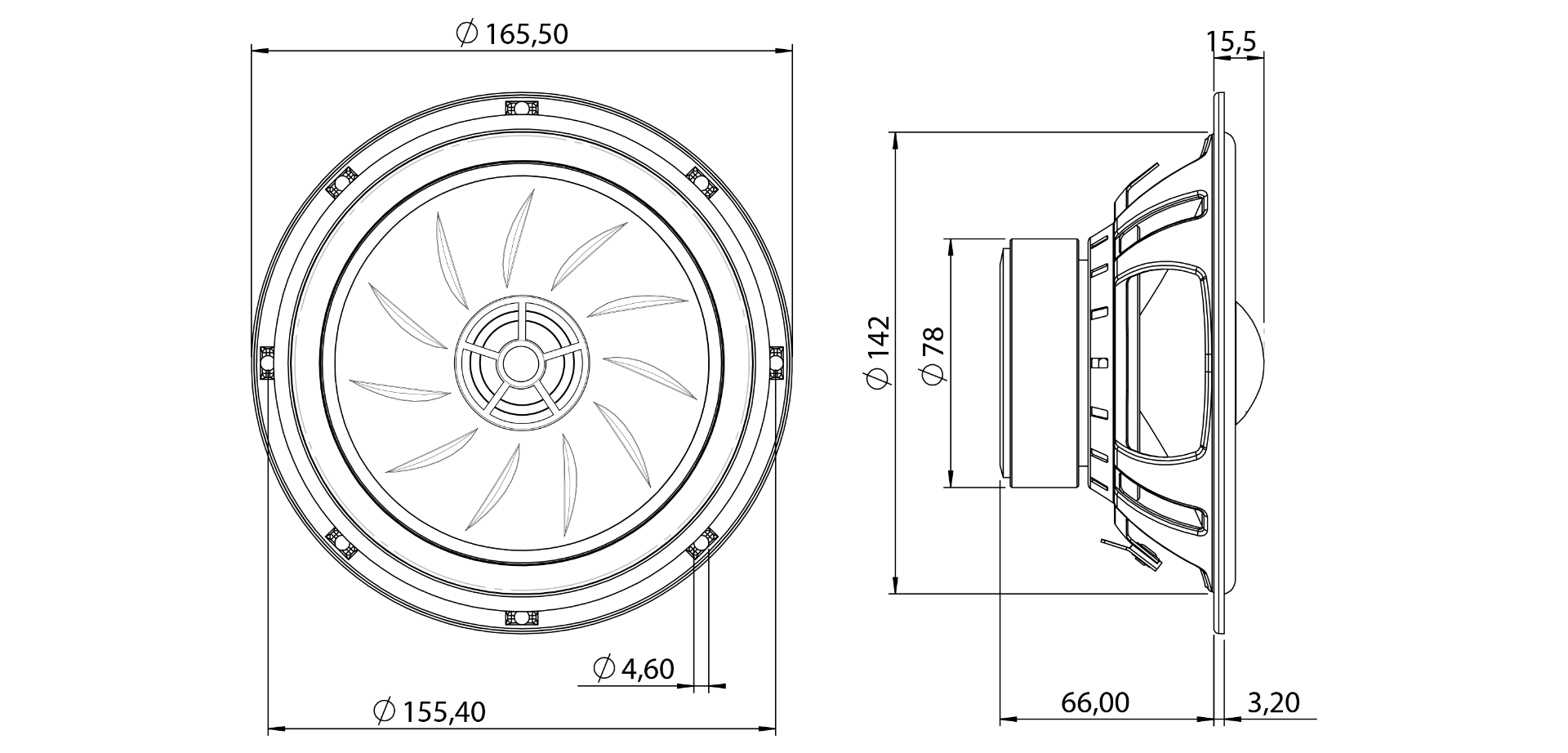 165 mm (6.5“) coaxial speaker system with integrated 25 mm (1”) fabric dome tweeter with permeable plastic touch protection for maximum sound transmission. Rib-stiffened glass fiber paper cone technology for particularly powerful and contoured bass reproduction, dynamic and to the point. Powder-coated metal basket in ETON's typical double strut design with additional ventilation openings and reinforcements. Powerful ferrite magnet with 3 Ohm impedance voice coil - for maximum efficiency even without an additional amplifier. Rated power handling: 70 W RMS, music power handling 100 W, impedance 3 Ohm, characteristic sound pressure 89 dB, outer diameter 165 mm, installation diameter 142 mm, installation depth 66 mm. With integrated high-quality tweeter capacitor. Engineered in Germany.