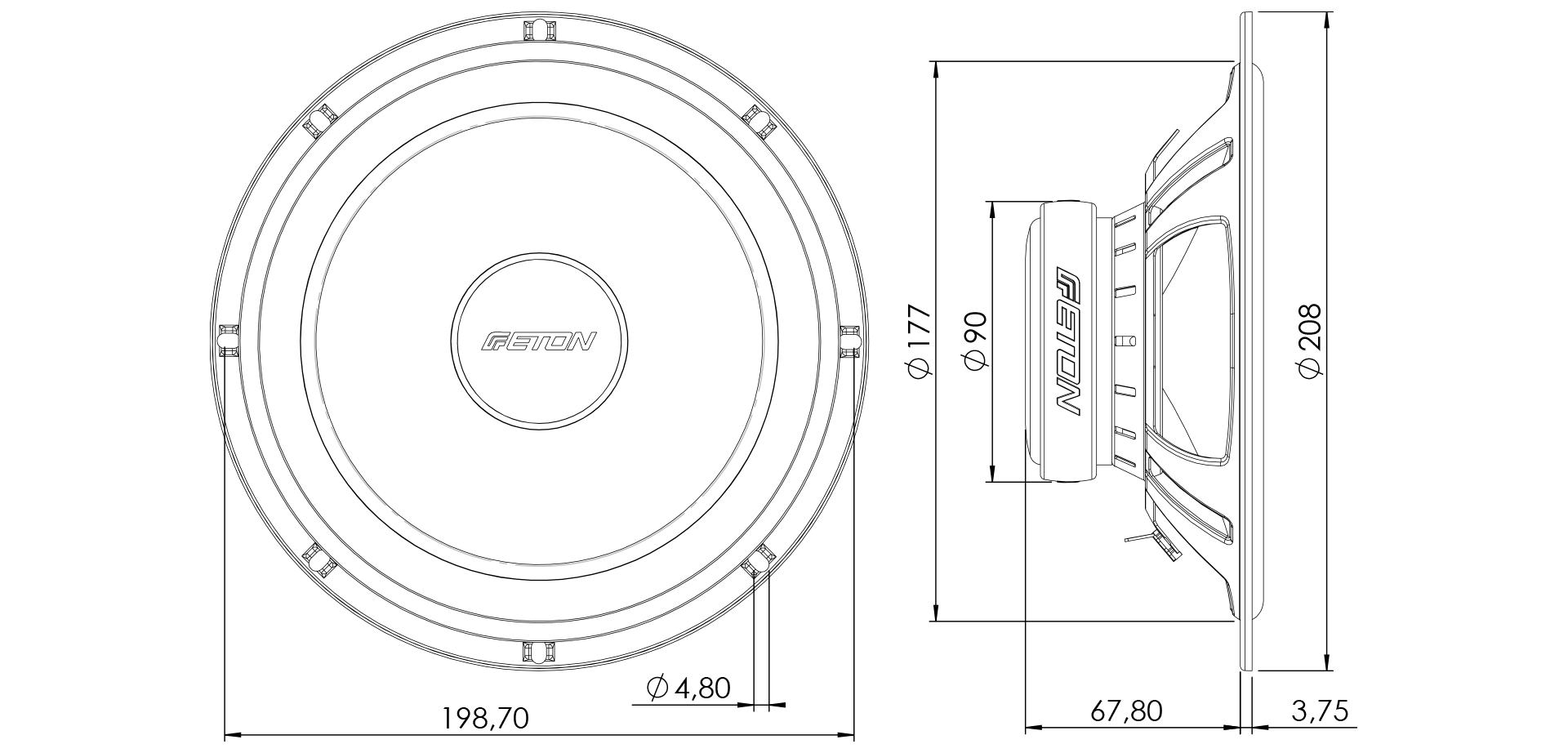 POW 20+ - 200 mm (8") 2-way component system with 28 mm (1 1/8") fabric tweeter in compact installation dimension with coupling volume. Fiberglass-reinforced 2-ply paper cone with strong ferrite magnet and gloss-turned base plate with large core bore. Stiffened, powder-coated metal basket with ventilation and high-quality connection terminals. Tweeter surface-mount and flush-mount enclosures with swivel & pivot function, including tweeter cable crossover, 3 ohm impedance, rated/music power handling 80 W RMS/120 W, 94 dB efficiency at 2.83V. Development and manufacturing Made in Germany.