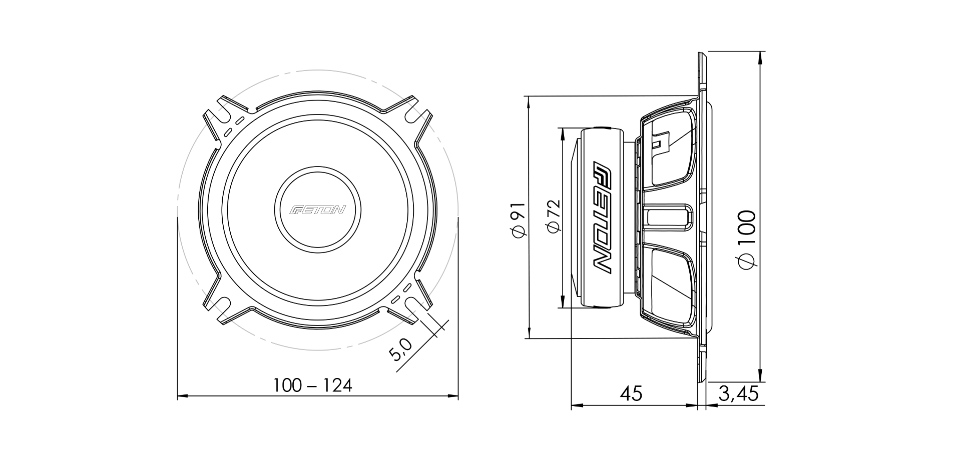 100 mm (4") bass/midrange driver with ribbed paper-fiberglass cone manufactured using a special production process. Powerful ferrite magnet with large core hole for best possible cooling. Stiffened, powder-coated metal basket in double strut design with extra ventilation openings. Heavy-duty 3 ohms voice coil for maximum performance even without an additional amplifier, directly on the series radio / head unit. 25 mm (1") aluminum dome tweeter with fabric surround for finest details, incl. high-quality 12 dB cable crossover, surface-mounted and built-in housing with swivel & swivel function. 50 W RMS rated power handling, 80 W music power handling with a characteristic sound pressure of 90 dB (2.83V/1m). 100 / 124 mm outer diameter and 91 mm cut-out diameter. Low installation depth of 45 mm. Engineered in Germany.