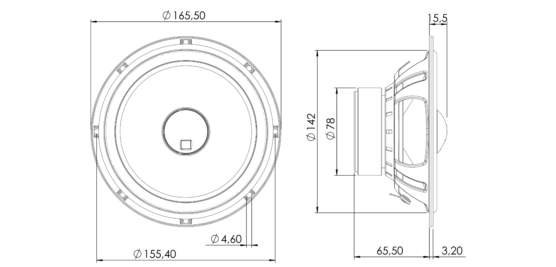LOW/MID-RANGE DRIVER - 165 mm outer diameter, 8 screw points, arranged in a circle. Recommended frequency range: 50 Hz - 3000 Hz.