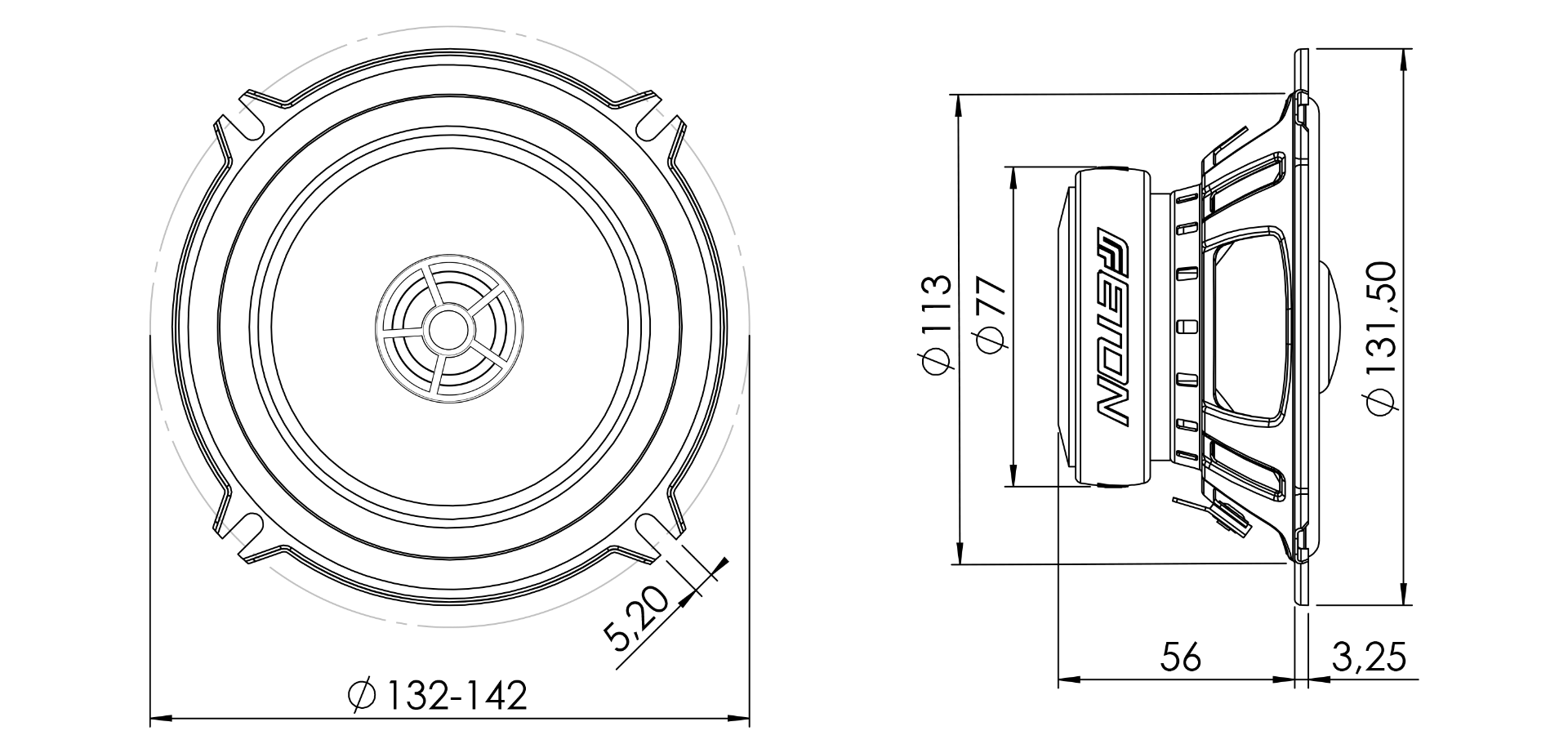 PSX 13 - 130 mm (5.25") coaxial system with integrated 19 mm (0.75") coated fabric tweeter with redesigned reinforced plastic touch guard for maximum transmittance. Coated paper diaphragm with strong ferrite magnet and new bottom plate design with milled cable slot. Powder coated metal basket with ventilation and high quality connection terminals. Tweeter includes integrated tweeter crossover, 4 ohm impedance, rated/music power handling 60 W RMS/100 W, 91 dB (1W/m) efficiency.